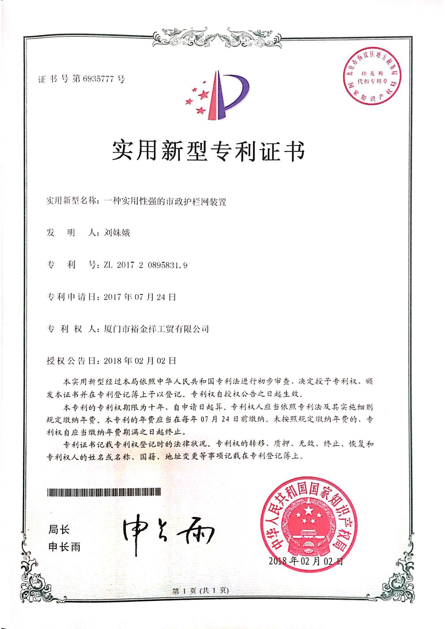 專(zhuān)利證書(shū)-實(shí)用性市政護欄網(wǎng)