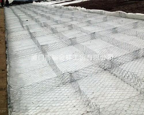 的高度較低,結構形式扁平而大;鍍層鋼絲直徑較格賓細,一般有雙隔板(鋼絲直徑2.0mm)、單隔板(2.2mm)兩種。常用的為雙隔板雷諾護墊,其優(yōu)點(diǎn)為施工方便、做護坡可有效防止石頭垮塌、增加結構的抗沖刷能力等。