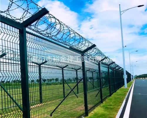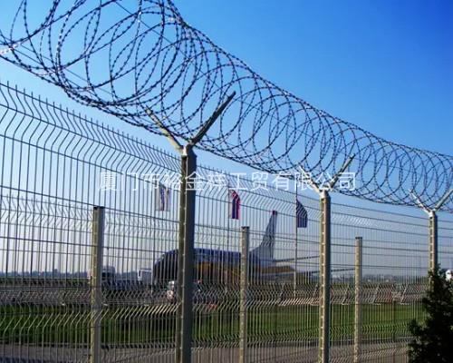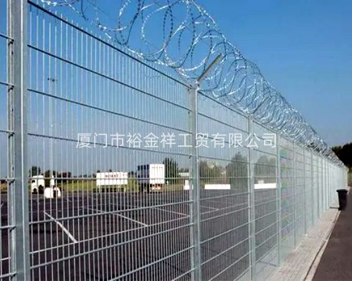 機場(chǎng)護欄網(wǎng)又稱(chēng)作“Y型安全防御護網(wǎng)”,是由V型支架立柱加強型焊接片網(wǎng),安全防盜連接件和熱鍍鋅刀片刺網(wǎng)組成強度和安全防御性級別很高。被廣泛應用在機場(chǎng),軍事基地等高安全場(chǎng)所。